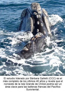 El estudio, liderado por la investigadora y presidenta del Centro de Conservación Cetacea de Chile, Bárbara Galletti, incluye un análisis de los avistamientos que se han realizado sobre la especie en el país desde 1964 hasta 2011. Entre los resultados se destaca el primer registro de potenciales conductas reproductivas para la especie en todo el Pacífico suroriental y la primera recaptura de un individuo fotografiado en 2010 y 2011. Al respecto, Galletti afirmó que “la ballena franca austral del Pacifico Suroriental es una de las poblaciones más desconocidas y aún no sabemos donde se reproducen o alimentan, por lo que estos nuevos descubrimientos nos entregan valiosa información sobre su presencia, comportamiento y uso del hábitat”.