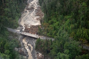 Material depositado sobre la vía está compuesto por barro, cenizas y árboles muertos tras la erupción de mayo de 2008, los que fueron arrastrados por las precipitaciones. Afortunadamente la emergencia se registró en un sector donde no se ubican viviendas cercanas.