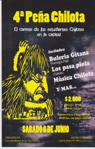 El sábado 08 de junio, a partir de las 21:00 hrs., los jóvenes de la Residencia Estudiantil de la “Casa Chilota”, realizaron en sus salones (García Reyes 596, Santiago), la 4ª PEÑA CHILOTA: “EL CARRETE DE LOS ESTUDIANTES CHILOTES EN LA CAPITAL”. El evento, organizado por los estudiantes chilotes pretende reunir fondos para mejorar la implementación de la Residencia Estudiantil; iniciativa digna de destacar y aplaudir. Esta peña que tuvo masiva concurrencia juvenil destacó por su festiva participación, haciendo que finalizara avanzado el trasnoche.