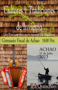 Para este Sábado 27 de Julio el municipio de Quinchao ha programado la actividad denominado “Encuentro con los cultores y tradiciones de invierno”, que permitirá reunir a músicos mayores de algunos rincones campesinos de Chiloé, con el objeto de compartir una reunión de amistad, música, recuerdos y memorias de su quehacer artístico, que los han identificado como animadores festivos en sus propias comunidades.