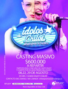 Este jueves 8 de agosto Enjoy Chiloé dará inicio al nuevo concurso “Ídolos de Chiloé, apuesta por tu talento”, el cual -durante tres meses- dará la oportunidad a artistas musicales locales para que puedan mostrar su talento sobre el escenario del bar Cenit.