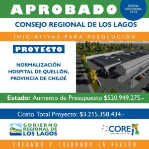 Por unanimidad de sus integrantes, el Pleno del Consejo Regional de los Lagos, CORE, que sesionó este miércoles en la comuna de Rio Negro, en la provincia de Osorno, aprobó el aumento de presupuesto para la ejecución de las obras complementarias del nuevo hospital de Quellón.